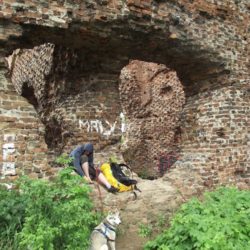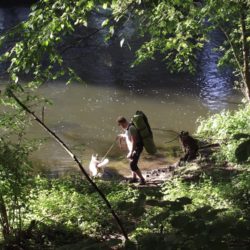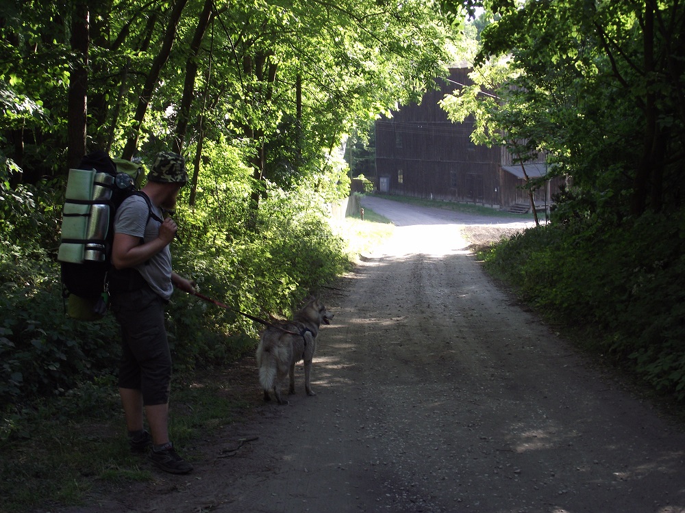 Spaliśmy pod namiotami, rozbijając się po prostu w lesie, nad rzeką albo jeziorem. Niestety nie mieliśmy możliwości sprawdzić, jak ośrodki oferujące noclegi odnoszą się do psów, bo jedyny, z którego chcieliśmy skorzystać – Ośrodek Chopinowski w Szafarni – o 18, kiedy do niego dotarliśmy, był już zamknięty na głucho, a telefon nie odpowiadał. Niby nic dziwnego, ale zmylił nas zapis w przewodniku, że „każdy wędrujący po Szlaku św. Jakuba może tu liczyć na nocleg”.