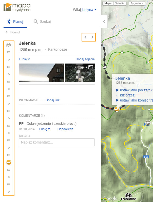 – wyświetlanie informacji o wyszukanych miejscach: zdjęć i opinii użytkowników w oparciu o dane z serwisu mapa-turystyczna.pl.