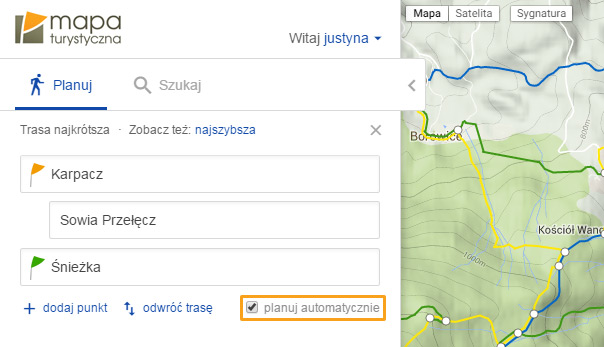 – wyświetlanie wyszukanej trasy na mapie oraz pokazanie jej długości, szacowanego czasu przejścia i szczegółowego przebiegu (miejsca i poszczególne szlaki na trasie),